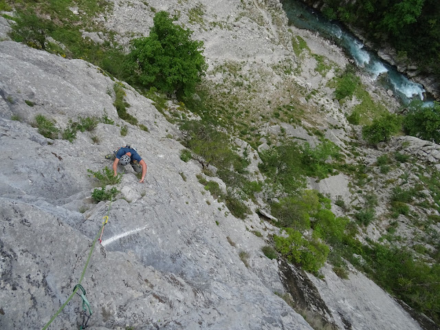 En ese largo solo me tocó meter las dos últimas chapas, pero no me dejó indiferente... En la foto de abajo, vemos a Guillem en un paso raro/ obligado para llegar a la laja, y mis zapatillas naufragadas en la chapa anterior donde tomé el relevo.