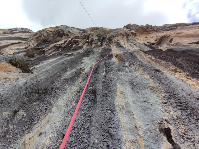 En el tercer largo hicimos lo mismo. Comenzó Ibra con un muro de chorreras muy bueno. Antes de el paso mas duro, le doy el relevo de nuevo y continúo yo. Tras no se como poder colocar una chapa colgado de la "nada" me veo obligado a colgarme de un gancho para limpiar unas regletas en un paso muy muy duro a bloque, que tras intentarlo varias veces, la humedad y suciedad de los cantos lo hacía "inhumano".
